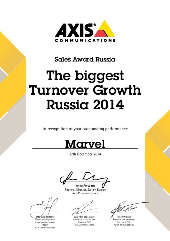 Являясь одним из самых молодых дистрибуторов вендора, компания Марвел оказалась и самым быстрорастущим. Продажи оборудования Axis увеличились на 141% по сравнению с прошлым годом. Кроме того, несмотря на замедление роста партнерской сети, в 2014 году было реализовано больше проектов, чем в предыдущем.